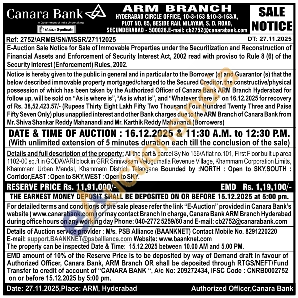 Details and full description of the property: All the part & parcel Sy No 156/A flat no. 101, First Floor built up area 1102-00 sq.ft in GODAVARI block in GRR Srinivasam Velugumatla Revenue Village, Khammam Corporation Limits, Khammam Urban Mandal, Khammam District, Telangana Bounded by:NORTH: Open to SKY,SOUTH : Corridor, EAST: Open to SKY, WEST: Open to SKY