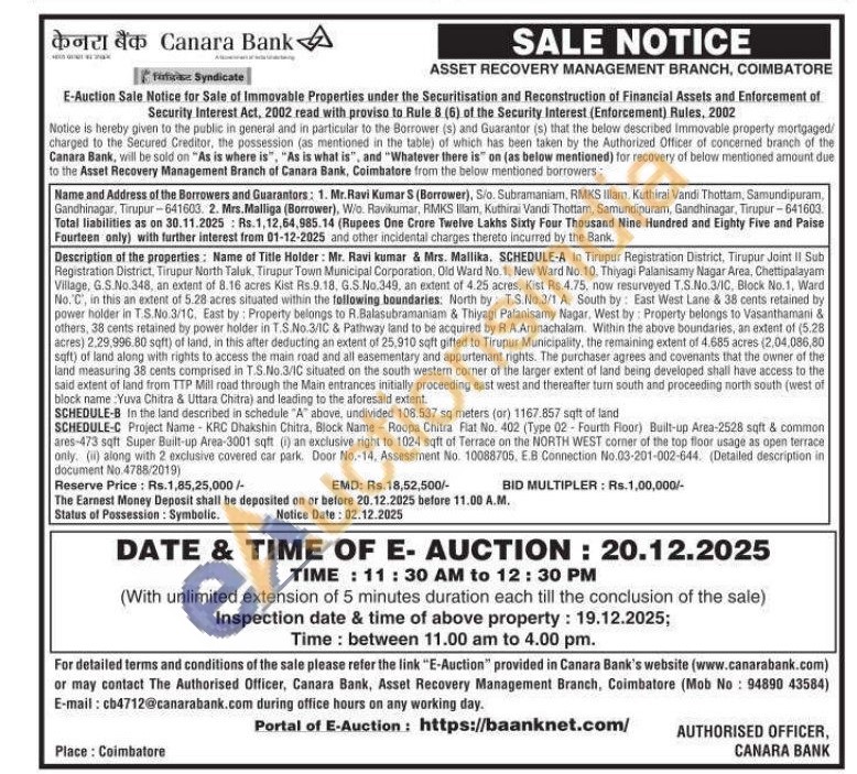 Description of the properties: Name of Title Holder: Mr. Ravi kumar & Mrs. Mallika. SCHEDULE-A In Tirupur Registration District, Tirupur Joint II Sub Registration District, Tirupur North Taluk, Tirupur Town Municipal Corporation, Old Ward No.1, New Ward No. 10. Thiyagi Palanisamy Nagar Area. Chettipalayam Village, G.S.No.348, an extent of 8.16 acres Kist Rs.9.18, G.S.No.349, an extent of 4.25 acres, Kist Rs.4.75, now resurveyed T.S.No.3/IC. Block No.1, Ward No.'C', in this an extent of 5.28 acres situated within the following boundaries: North by T.S.No.3/1 A, South by East West Lane & 38 cents retained by power holder in T.S.No.3/1C. East by: Property belongs to R.Balasubramaniam & Thiyagi Palanisamy Nagar, West by: Property belongs to Vasanthamani & others, 38 cents retained by power holder in T.S.No.3/IC & Pathway land to be acquired by R.A.Arunachalam. Within the above boundaries, an extent of (5.28 acres) 2.29,996.80 sqft) of land, in this after deducting an extent of 25,910 soft gifted to Tirupur Municipality, the remaining extent of 4.685 acres (2,04,086,80 sqft) of land along with rights to access the main road and all easementary and appurtenant rights. The purchaser agrees and covenants that the owner of the land measuring 38 cents comprised in T.S.No.3/IC situated on the south western corner of the larger extent of land being developed shall have access to the said extent of land from TTP Mill road through the Main entrances initially proceeding east west and thereafter turn south and proceeding north south (west of block name Yuva Chitra & Uttara Chitra) and leading to the aforesaid extent. SCHEDULE-B In the land described in schedule "A" above, undivided 108.537 sq meters (or) 1167.857 sqft of land SCHEDULE-C Project Name - KRC Dhakshin Chitra, Block Name Roopa Chitra Fiat No. 402 (Type 02-Fourth Floor) Built-up Area-2528 sqft & common ares-473 sqft Super Built-up Area-3001 sqft (i) an exclusive right to 1024 sqft of Terrace on the NORTH WEST corner of the top floor usage as open terrace only. (ii) along with 2 exclusive covered car park. Door No.-14, Assessment No. 10088705, E.B Connection No.03-201-002-644. (Detailed description in document No.4788/2019)
