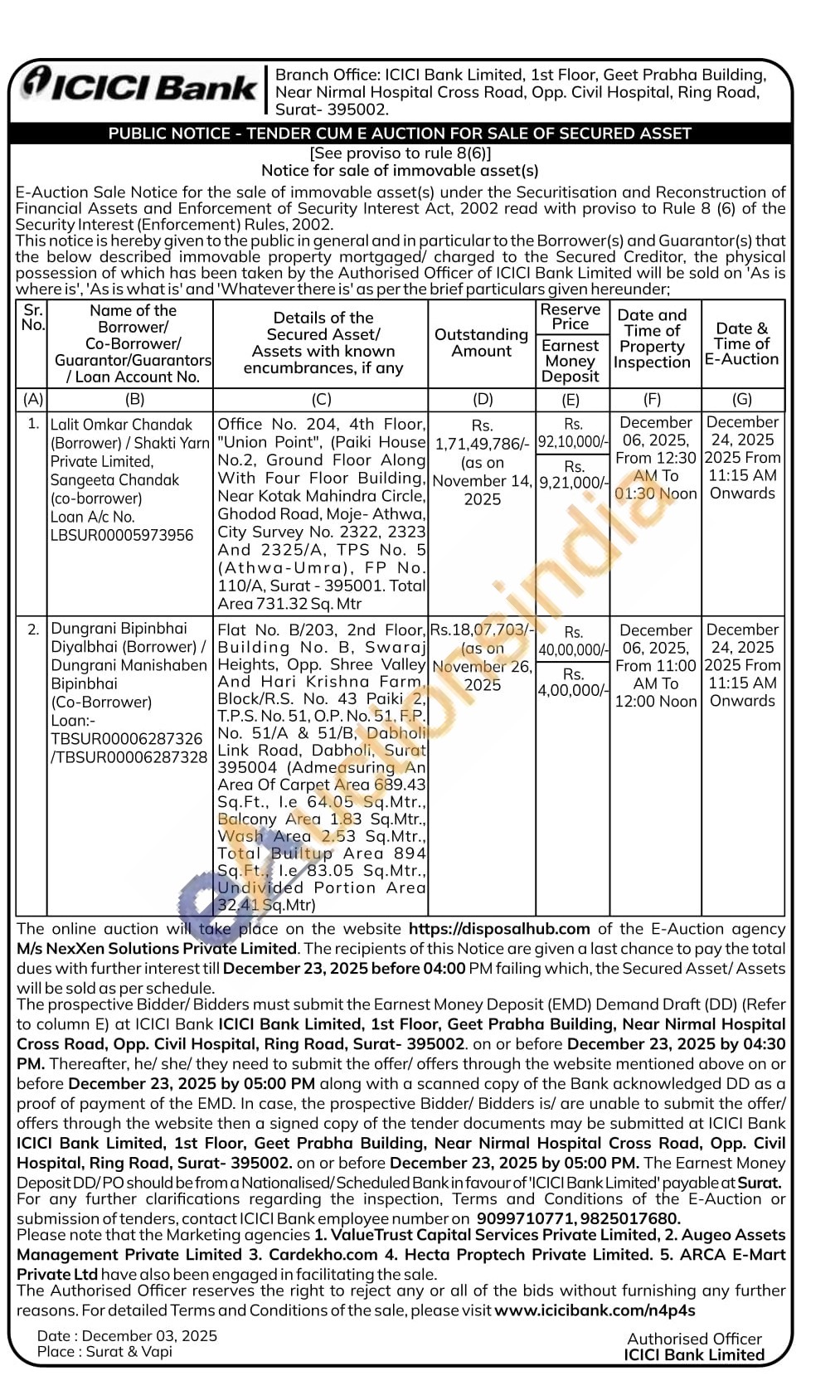 Flat No. B/203, 2nd Floor, Building No. B. Swaraj Heights, Opp. Shree Valley And Hari Krishna Farm. Block/R.S. No. 43 Paiki 2. T.P.S. No. 51. O.P. No. 51, F.P. No. 51/A & 51/B, Dabholi Link Road, Dabholi, Surat 395004 (Admeasuring An Area Of Carpet Area 689.43 Sq.Ft., l.e 64.05 Sq.Mtr.. Balcony Area 1.83 Sq.Mtr.. Wash Area 2.53 Sq.Mtr... Total Builtup Area 894 Sq.Ft., le 83.05 Sq.Mtr., Undivided Portion Area 32.41 Sq.Mtr)