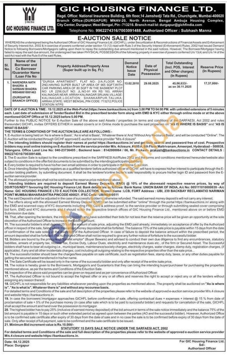 "DURGA APARTMENT, FLAT NO: 2/A FLOOR NO 2ND HAVING SUPER BUILT UP AREA OF 965 SOFT WITH CAR PARKING AREA OF 80 SOFT IN THE BASMENT PLOT NO LR 2256 GUT NO JLNO-91 KN RS IT NO JLNO-91 KN RS 163, ARRAH KALINAGAR NEAR: ARRAH KALINAGAR SRIJANI VILLAGE KALINAGAR LOCATION: SHANKARPUR, TALUKA: ARRAH STATE WEST BENGAL, PIN CODE: 713212 POLICE STATION: NTPS