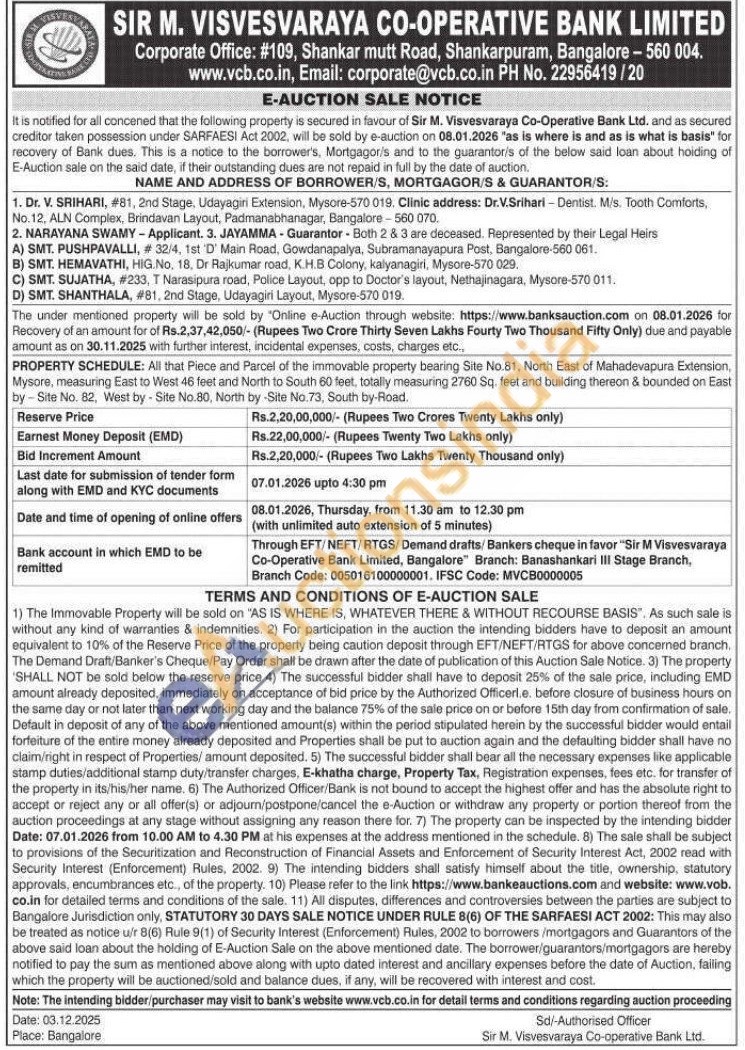 PROPERTY SCHEDULE: All that Piece and Parcel of the immovable property bearing Site No.81, North East of Mahadevapura Extension, Mysore, measuring East to West 46 feet and North to South 60 feet, totally measuring 2760 Sq. feet and building thereon & bounded on East by-Site No. 82, West by Site No.80, North by -Site No.73, South by-Road