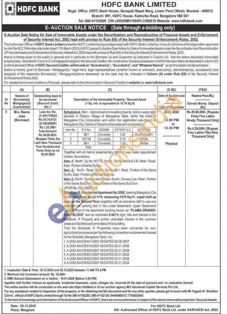 Schedule-A: Non-Agricultural immovable property, held on warg right, situated in Padavu Village of Mangalore Taluk, within the limits of Mangalore City Corporation and within the registration sub-district of Mangalore City, District of Dakshina Kannada Together with all mamul easementary rights of way, water appurtenant thereto. Boundaries Item-1: North: Sy No. 167/18, South: Sy.No.96/24 & 2 B. West Road East: Portion of Same Sy.No. Item-2: North Road. South: Sy No. 96/1. West: Portion of the Same Sy No. East: Portion of the Same Sy. No. Item 3: North: Survey Line & Road. South: Survey Line. West: Portion of the Same Sub Divn. East Portion of the Same Sub Divn. UPOR No. 512-3008/1-10 Schedule-B: Residential Apartment No.205E, bearing Mangaluru City Corporation Door No.22-1/10, measuring 1570 Sq.Ft., super built up area, on the Second Floor, together with an exclusive right to use one reserved car parking slot in the Lower Basement/ Upper Basement/Ground Floor of the Apartment building known as "PLAMA GRANDE-EAST BLOCK" and an undivided 0.541% right, title and interest in the Schedule 'A' Property and similar undivided interest in the common areas and facilities and amenities of the building. That the Schedule 'A' Properties have been converted for non-agricultural purpose as per the following conversion endorsement issued by the Tahsildar, Mangalore Taluk, Viz: 1.A.DIS/LNA/CR/441/2007-08 DATED 29.08.2007, 2. A.DIS/LNA/CR/919/2007-08 DATED 30.01.2008 3. A.DIS/LNA/CR/920/2007-08 DATED 30.01.2008. 4.A.DIS/LNA/CR/921/2007-08 DATED 30.01.2008 5.ADIS/LNA/CR/922/2007-08 DATED 30.01.2008, 6.A DIS/LNA/CR/925/2007-08 DATED 30.01.2008