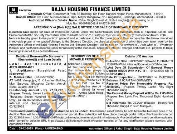 Schedule Property All that piece and parcel of the immovable property Being Flat No 401 Building No-i, Vasu Pujya BK Homes Rs No 21/a, Paikee 1,21/B Fp No 228 Tps No 70 (chhaprabhatha Amroli Kosad Utran) Nr Amroli Circle, Amroli Main Road Surat-395010