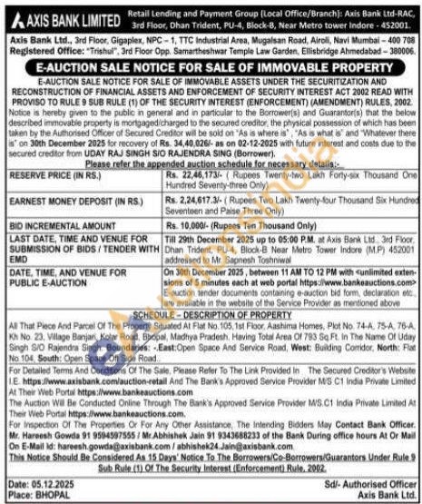 All That Piece And Parcel Of The Property Situated At Flat No. 105, 1st Floor Aashima Homes, Plot No. 74-4, 75-A, 764 Kh No. 23, Village Banjari, Kolar Road, Bhopal, Madhya Pradesh. Having Total Area Of 783 Sq Ft. in The Name Of Uday Singh S/O Rajendra Singh. Boundaries: - East: Open Space And Service Road, West: Building Corridor, North: Flat No 104, South: Open Space Off Side Road