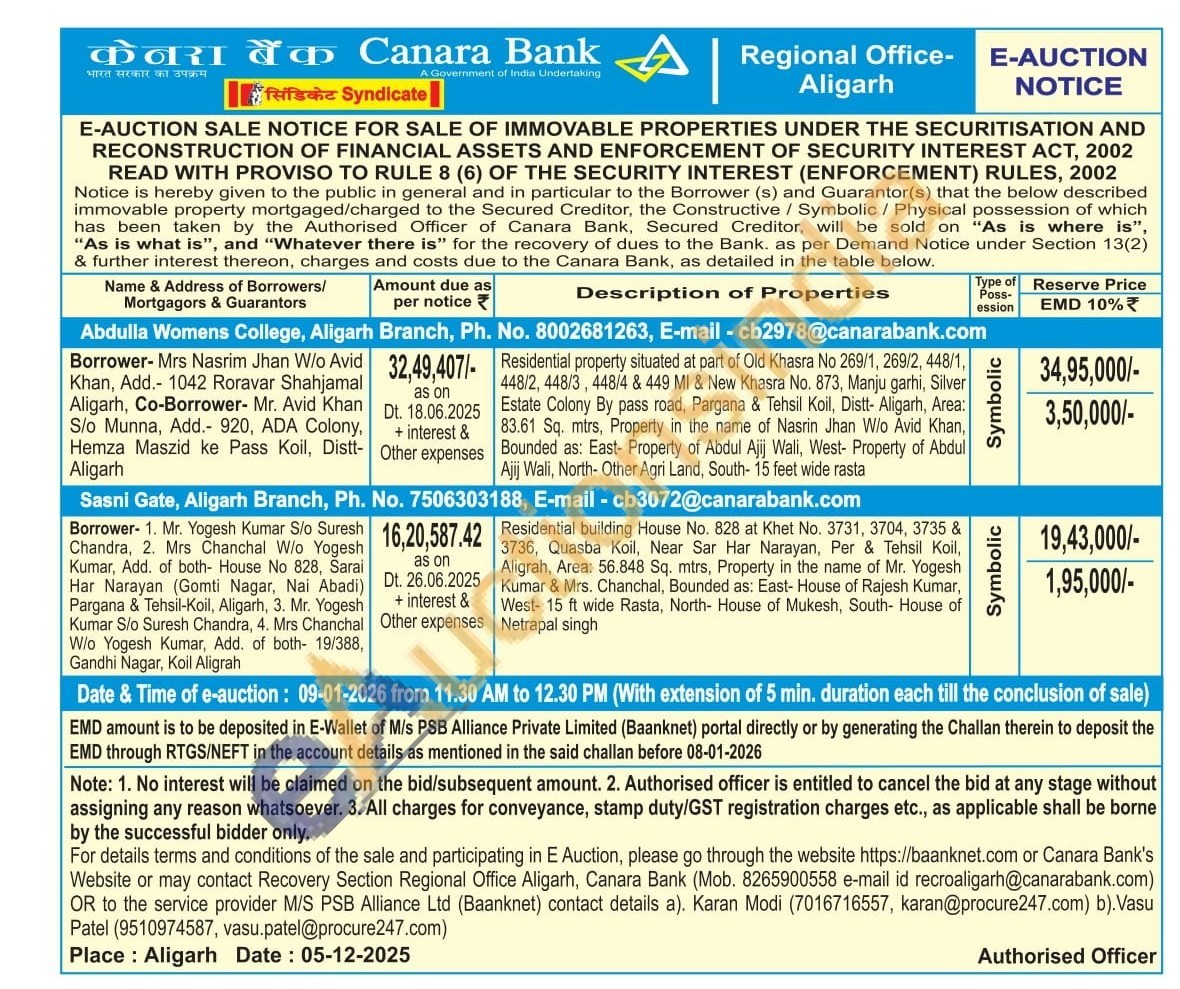 Residential property situated at part of Old Khasra No 269/1, 269/2, 448/1, 448/2, 448/3, 448/4 & 449 MI & New Khasra No. 873, Manju garhi, Silver Estate Colony By pass road, Pargana & Tehsil Koil, Distt- Aligarh, Area: 83.61 Sq. mtrs, Property in the name of Nasrin Jhan W/o Avid Khan, Bounded as: East- Property of Abdul Ajij Wali, West- Property of Abdul Ajij Wali, North- Other Agri Land, South- 15 feet wide rasta