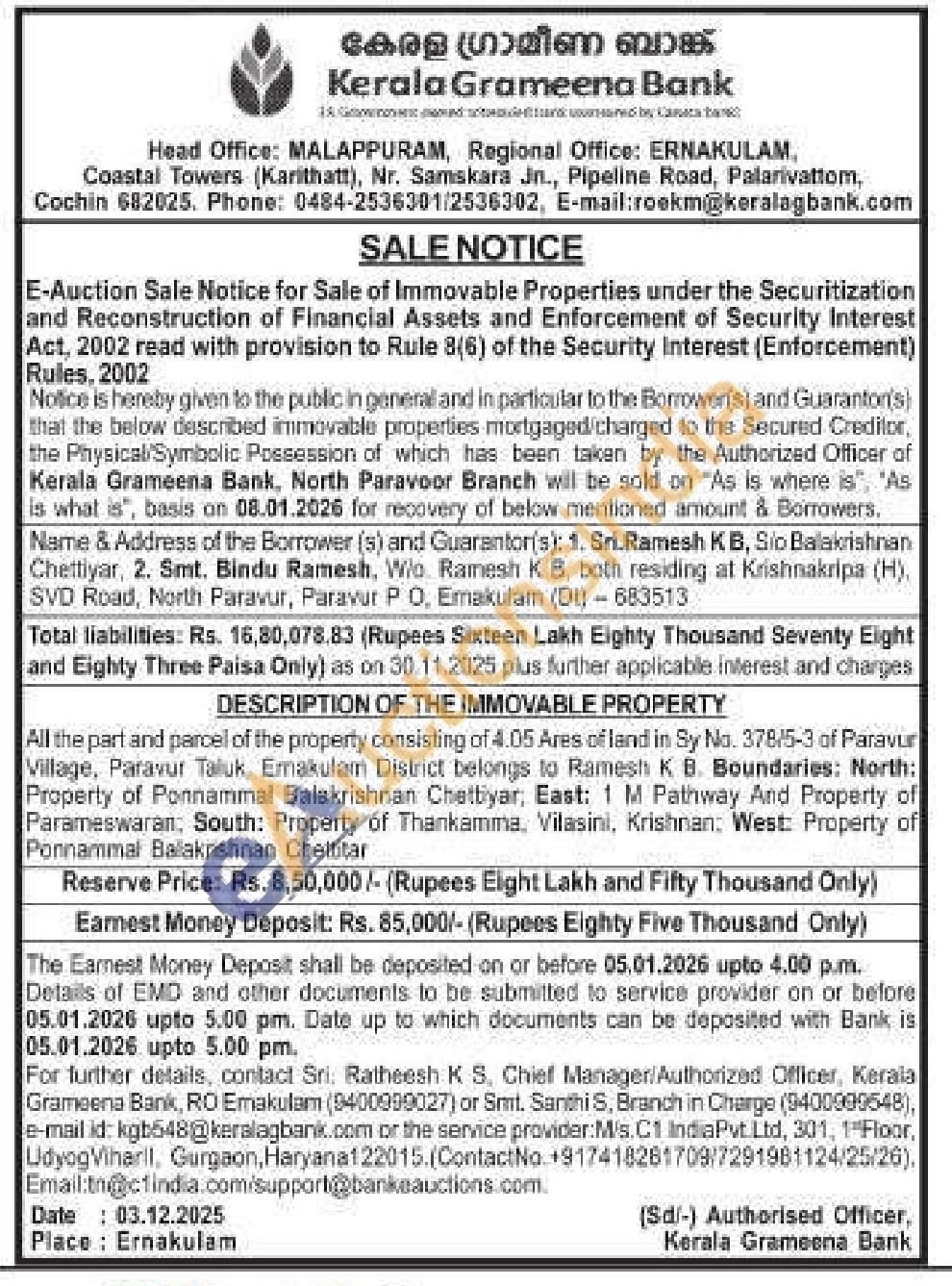 DESCRIPTION OF THE IMMOVABLE PROPERTY : All the part and parcel of the property consisting of 4.05 Ares of land in Sy No. 378/5-3 of Paravur Village, Paravur Taluk, Emakulam District belongs to Ramesh K B. Boundaries: North: Property of Ponnammal Balakrishnan Chettiyar, East: 1 M Pathway And Property of Parameswaran, South: Property of Thankamma, Vilasini, Krishnan, West: Property of Ponnammal Balaknshnan Chettitar
