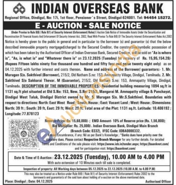 DESCRIPTION OF THE IMMOVABLE PROPERTIES:- Residential building measuring 1094 sq.ft in 1131 sq.ft plot situated at Old S.No: 153, New. S.No: 215/2, Mangarai M. Ammapatty village & Panchayat, Dindigul West Taluk, Dindigul District owned by Mr. S. Murugan Sjo. Mr.S.Sakthivel. Boundaties with respect to directions: North: East West Road: South: House; East: Vacant Land; West: House: Dimensions: North: 39 ft; South: 39 ft. East: 29 ft: West: 29 ft. Total area of the Plot: 1131 sq.ft. Latitude: 10.406192; Longitude: 77.878123