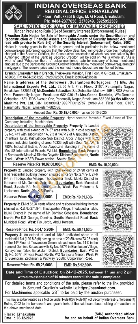 Description of the immovable Property: Property 3: EM of 53.94 cents of land and residential building thereon situated at R.S.No.274/9-1, Thodupuzha Village, Thodupuzha Taluk, Idukki District in the name of Mr. Dominic Sebastian. Boundaries: North: P/o K.S George, Dominic, South: Municipal Road, East: Municipal Road, West: P/o Jacob, Abdul Kareem