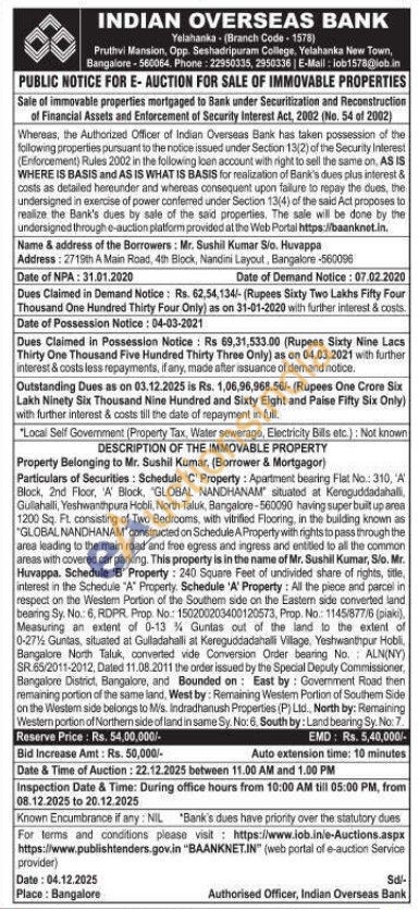 DESCRIPTION OF THE IMMOVABLE PROPERTY : Property Belonging to Mr. Sushil Kumar, (Borrower & Mortgagor) : Particulars of Securities: Schedule 'C' Property: Apartment bearing Flat No.: 310, Α' Block, 2nd Floor, 'A' Block, "GLOBAL NANDHANAM" situated at Kereguddadahalli, Gullahalli, Yeshwanthpura Hobli, North Taluk, Bangalore-560090 having super built up area 1200 Sq. Ft. consisting of Two Bedrooms, with vitrified Flooring, in the building known as "GLOBAL NANDHANAM" constructed on Schedule A Property with rights to pass through the area leading to the main road and free egress and ingress and entitled to all the common areas with covered car parking. This property is in the name of Mr. Sushil Kumar, Slo. Mr. Huvappa. Schedule 'B' Property: 240 Square Feet of undivided share of rights, title, interest in the Schedule "A" Property. Schedule 'A' Property: All the piece and parcel in respect on the Westem Portion of the Southem side on the Eastern side converted land bearing Sy. No.: 6, RDPR, Prop. No.: 150200203400120573, Prop. No.: 1145/877/6 (piaki), Measuring an extent of 0-13 % Guntas out of the land to the extent of 0-27% Guntas, situated at Gulladahalli at Kereguddadahalli Village, Yeshwanthpur Hobli, Bangalore North Taluk, converted vide Conversion Order bearing No. ALN(NY) SR.65/2011-2012, Dated 11.08.2011 the order issued by the Special Deputy Commissioner, Bangalore District, Bangalore, and Bounded on: East by: Govemment Road then remaining portion of the same land, West by: Remaining Western Portion of Southem Side on the Westem side belongs to M's. Indradhanush Properties (P) Ltd., North by: Remaining Western portion of Northern side of land in same Sy. No: 6, South by: Land bearing Sy. No: 7