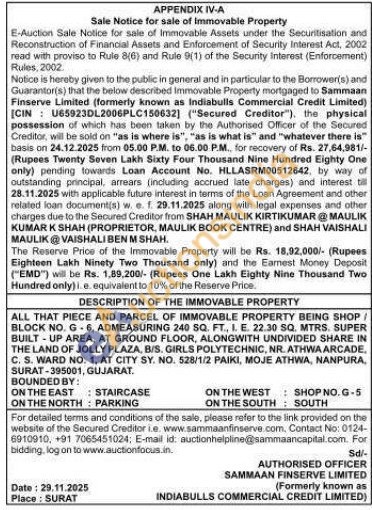 DESCRIPTION OF THE IMMOVABLE PROPERTY : ALL THAT PIECE AND PARCEL OF IMMOVABLE PROPERTY BEING SHOP/BLOCK NO. G6, ADMEASURING 240 SQ. FT., J. E. 22.30 SQ. MTRS. SUPER BUILT-UP AREA, AT GROUND FLOOR, ALONGWITH UNDIVIDED SHARE IN THE LAND OF JOLLY PLAZA, B/S. GIRLS POLYTECHNIC, NR. ATHWA ARCADE C. S. WARD NO. 1, AT CITY SY. NO. 528/1/2 PAIKI, MOJE ATHWA, NANPURA, SURAT-395001, GUJARAT.