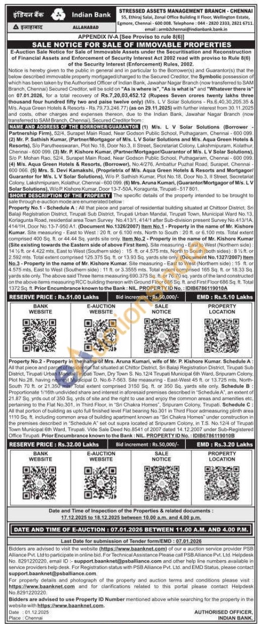 Property No.1 - Schedule A: All that piece and parcel of residential building situated at Chittoor District, Sri Balaji Registration District, Tirupati Sub District, Tirupati Urban Mandal, Tirupati Town, Municipal Ward No.13. Korlagunta Road, residential area Town Survey No.413/1, 414/1 after Sub-division present Survey No.413/1A, 414/1H, Door No. 13-7-950 A1. (Document No.1326/2007) Item No.1-Property in the name of Mr. Kishore Kumar. Site measuring East to West: 20 ft. or 6.100 mts, North to South: 20 ft. or 6.100 mts. Total extent comprised 400 Sq. ft. or 44.44 Sq. yards site only. Item No.2-Property in the name of Mr. Kishore Kumar (Site existing towards the Eastern side of above First Item). Site measuring-East to West (Northen side): 14% ft. or 4.422 mts, East to West (Southern side): 15 ft. or 4.575 mts, North to South (both sides): 8% ft. or 2.592 mts. Total extent comprised 125.375 Sq. ft. or 13,93 Sq. yards site only. (Document No. 1327/2007) Item No.3-Property in the name of Mr. Kishore Kumar. Site measuring - East to West (Northern side): 15 ft. or 4.575 mts, East to West (Southern side): 11 ft. or 3.3555 mts, Total extent comprised 165 Sq. ft. or 18.33 Sq. yards site only. The above said Three Items measuring 690.375 Sq. ft. or 76.70 sq. yards of the land constructed on the above items measuring RCC building thereon with Ground Floor 686 Sq. ft. and First Floor 686 Sq. ft. Total 1372 Sq. ft. Prior Encumbrance known to the Bank: NIL. PROPERTY ID No.: IDIB6786119010A