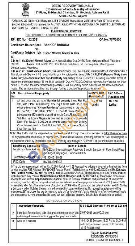1 All that piece and parcel of Residential property being Flat No. 203, 2nd Floor Admeasuring 1050 sq.ft super build up in the scheme known as "Kishan Residency" constructed on the land of R.S.No.291, C.S.NO. 3478,T.P.No. 1, F.PNo.311 paikee Plot No. 8, admeasuring 352 sq.mtrs situated at mouje Gam Akota, Dist. and Sub Dist. Vadodara, Gujarat is bounded as under-On or towards East:- Flat No 201 & 202,On or towards West:-Rajkumar Society, On or towards North:- Final Plot No. 312. On or towards South:-Final Plot No. 308.