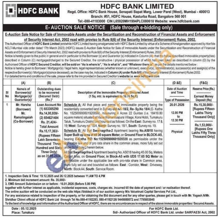 Schedule A: All that piece and parcel of immoveable property being the residentially converted land in Survey old no. 18/2, Re- Sy.No 18/4 (E-Katha No. 152500900601920099) measuring 4 Acres 22 Guntas (ie. 18419.80 square meters) situated at Vasanthanarasapura Village, Kora Hobli, Tumakuru Taluk, Tumakuru District and bounded as follows: On the East: Survey no. 17 & 19: West: Survey no. 18/4, North: Survey no. 18/1, South: Survey no. 19.