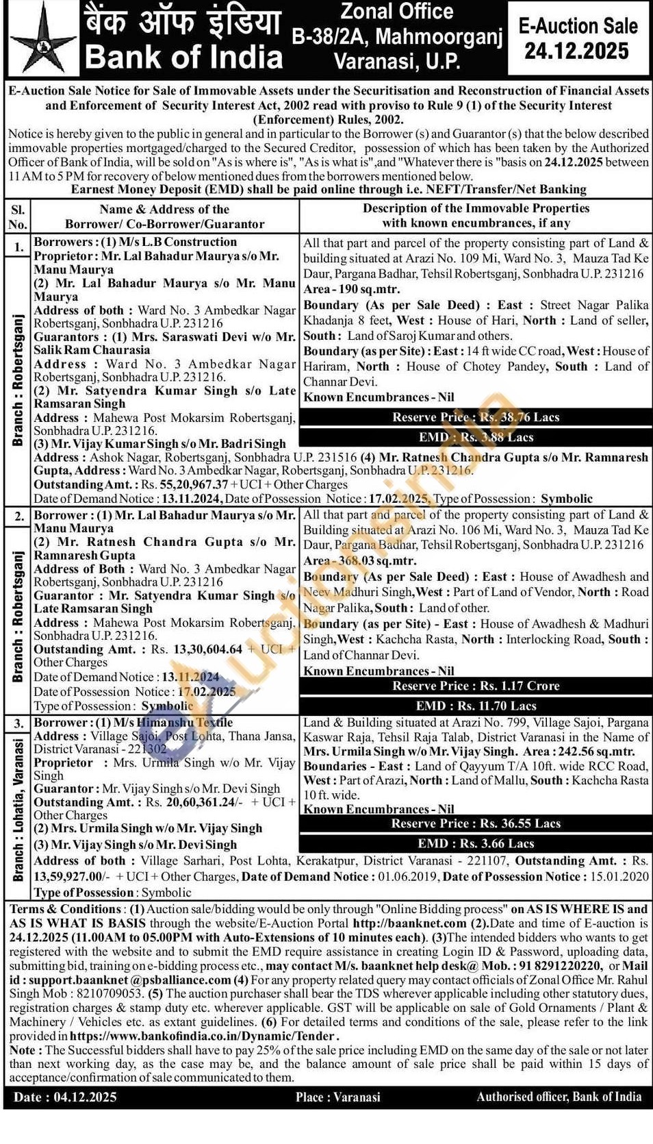 Land & Building situated at Arazi No. 799, Village Sajoi, Pargana Kaswar Raja, Tehsil Raja Talab, District Varanasi in the Name of Mrs. Urmila Singh w/o Mr. Vijay Singh. Area: 242.56 sq.mtr. Boundaries - East: Land of Qayyum T/A 10ft. wide RCC Road, West: Part of Arazi, North: Land of Mallu, South: Kachcha Rasta 10 ft. wide.