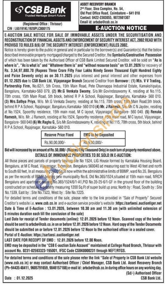 All those pieces and parcels of property bearing site No 1524, LIG House formed by Karnataka Housing Board, Bengaluru, at M C Road, Vijayanagar, Extension, Bengaluru 560040 ad measuring east to West 40 feet and north to South 60 feet, In all measuring 2400 Sq.Ft now within the administrative limits of BBMP, ward No.35, Bengaluru as per the records of BBMP bearing new municipality No.6, Old No.365/1524, situated at 15th main road, MRCR Bengaluru and apartment bearing No.365/1524/6/1-A1, PID No.35-25-6/1-GF in the ground floor of the building constructed on schedule A property measuring 1200 Sq.Ft of super build up area; North by: Road, South by: Site No. 1539, East by: Site No.1523, West by: Site No. 1225