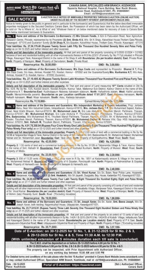 1)All that part and parcel of the property consisting of 0.0506 (0.0324 +0.0182) hectares of land and residential building with all other improvements thereon in R.S No.223/31 (Formerly Sy. No.77/7pt) situated in Pilicode Village, Kasaragod Taluk, Kasaragod District in the name of Sri Shaju K with Boundaries: (As per location sketch): East: Private Road, North: Property of Narayani, West: Property of Damodaran, South: Private Road