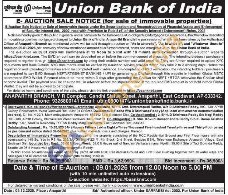 Description of Immovable Properties: All that part of the property consisting of the RCC Residential Ground and First Floor house with site admeasuring 145 Sq. Yds in RS No: 252/3A, Dr. No: 4-221/1. 4th Block, 2nd Street, Besides BSNL Telephone Exchange, Anaparthi Village. East Godavari Dist, bounded by: East: 33.00 ft Road, West: 33.0 ft House wall of Nandam Venkataramana, North: 30.06 ft Site of Tadi Govinda Reddy, South: 39.06 ft House wall of Sathi Satyanarayana Reddy