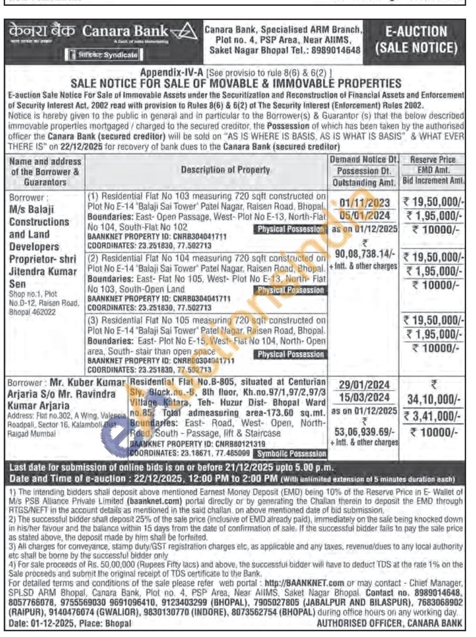 Residential Flat No.B-805, situated at Centurian Sly, Block.no.-B, 8th floor, Kh.no.97/1,97/2,97/3 Village Katara, Teh- Huzur Dist- Bhopal Ward no.85. Total admeasuring area-173.60 sq.mt. Boundaries: East Road, West- Open, North-Road, South-Passage, lift & Staircase