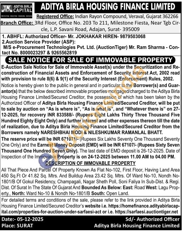 DESCRIPTION OF IMMOVABLE PROPERTY : All That Piece And Parcel Of Property Known As Flat No-102, First Floor, Having Land Area 450 Sq.Ft Or 41.82 Sq. Mtrs. And Buildup Area 23.42 Sq. Mtrs. Of Ward No-10, Nondh No-1801/B Of Gokul Residency, Champagali, Nagar Sheth Poll, Soni Faliya In Sub-Dist. & Regi. Dist. Of Surat In The State Of Gujarat And Bounded As Below: East: Road West: Lagu Prop-erty., North: Ward No-10 & Nondh No-1801/B South: Open Land