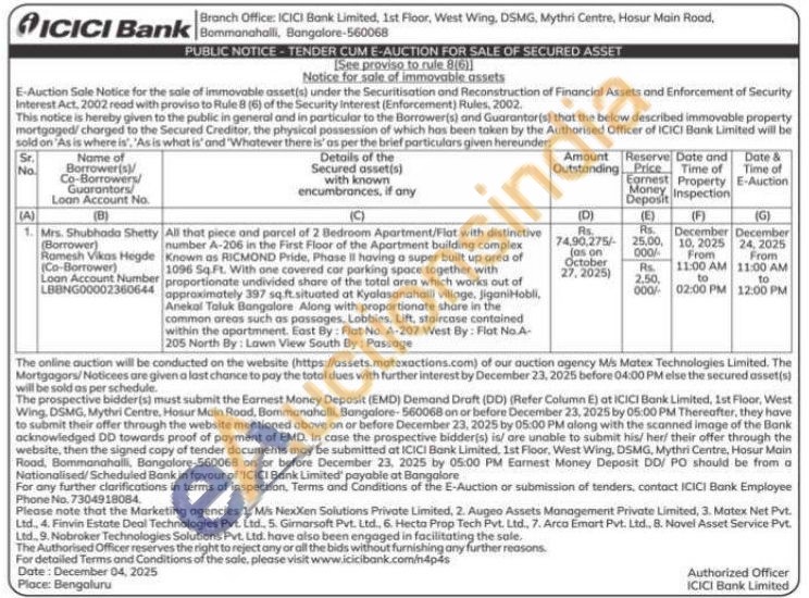 All that piece and parcel of 2 Bedroom Apartment/Flat with distinctive number A-206 in the First Floor of the Apartment building complex Known as RICMOND Pride, Phase Il having a super built up area of 1096 Sq.Ft. With one covered car parking space together with proportionate undivided share of the total area which works out of approximately 397 sq.ft situated at Kyalasanahalli village, jigani Hobli, Anekal Taluk Bangalore Along with proportionate share in the common areas such as passages, Lobbies, Lift, staircase contained within the apartmnent. East By: Flat No. A-207 West By: Flat No.A-205 North By: Lawn View South By: Passage