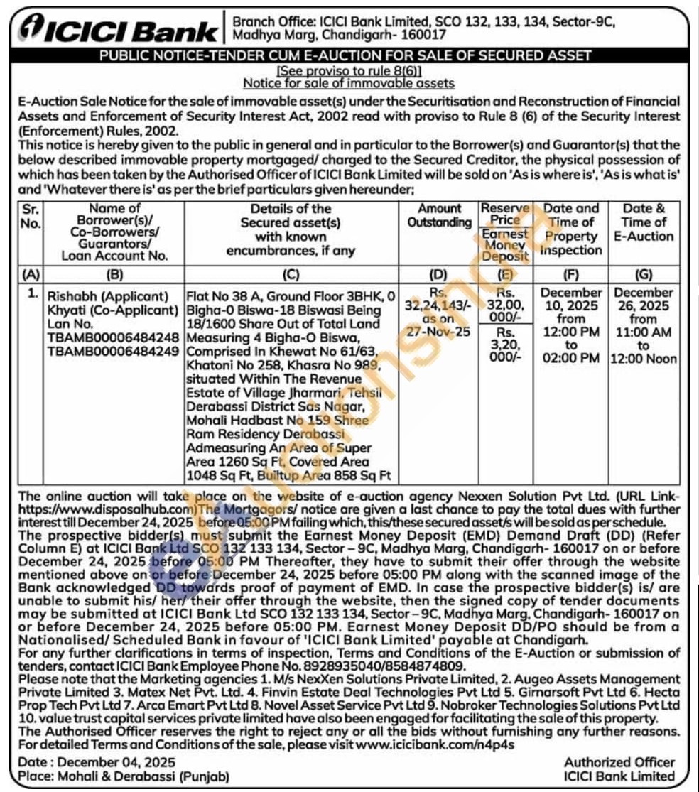 Flat No 38 A, Ground Floor 3BHK, 0 Bigha-0 Biswa-18 Biswasi Being 18/1600 Share Out of Total Land Measuring 4 Bigha-O Biswa, Comprised In Khewat No 61/63, Khatoni No 258, Khasra No 989, situated Within The Revenue Estate of Village Jharmari, Tehsil Derabassi District Sas Nagar, Mohali Hadbast No 159 Shree Ram Residency Derabassi Admeasuring An Area of Super Area 1260 Sq Ft, Covered Area 1048 Sq Ft, Builtup Area 858 Sq Ft