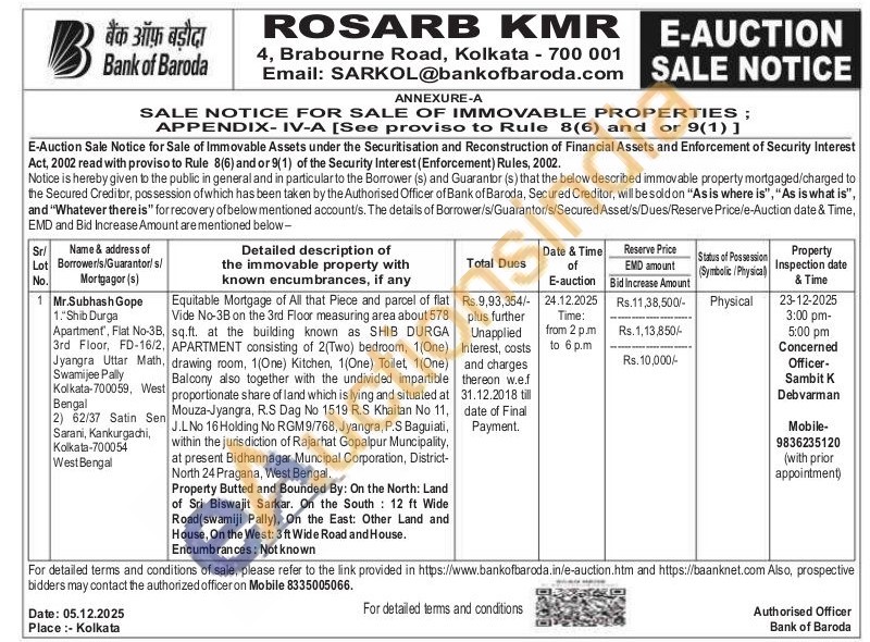 Concerned Officer- Sambit K Debvarman Mobile No : 9836235120 / Authorised Officer Mobile No : 8335005066