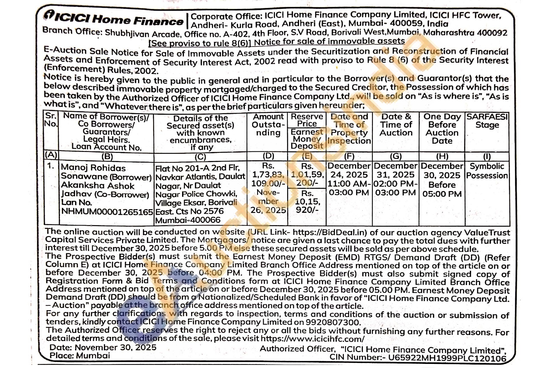Flat No 201-A 2nd Flr, Navkar Atlantis, Daulat Nagar, Nr Daulat Nagar Police Chowki, Village Eksar, Borivali East. Cts No 2576 Mumbai-400066