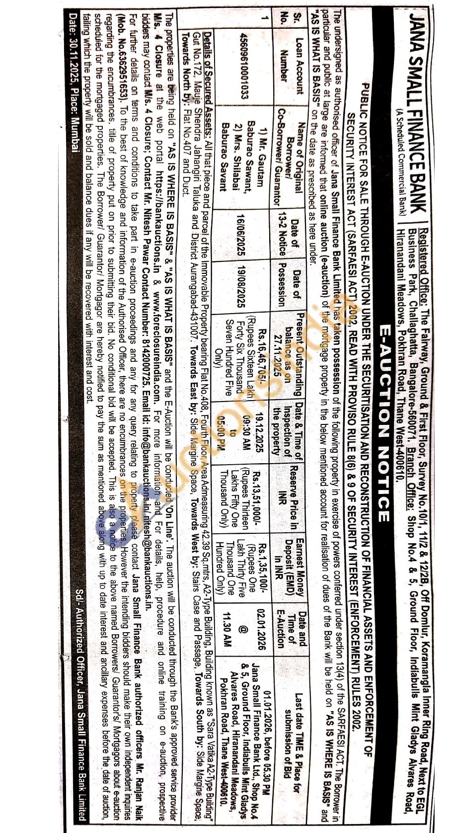 Details of Secured Assets: All that piece and parcel of the Immovable Property bearing Flat No.408, Fourth Floor, Area Admeasuring 42.39 Sq.mtrs, A2-Type Building, Building known as "Sara Vatika A2-Type Building" Gut No.172, Mauje Shendra Jahangiri Taluka and District Aurangabad-431007. Towards East by: Side Margine Space, Towards West by: Stairs Case and Passage, Towards South by: Side Margine Space, Towards North by: Flat No.407 and Duct