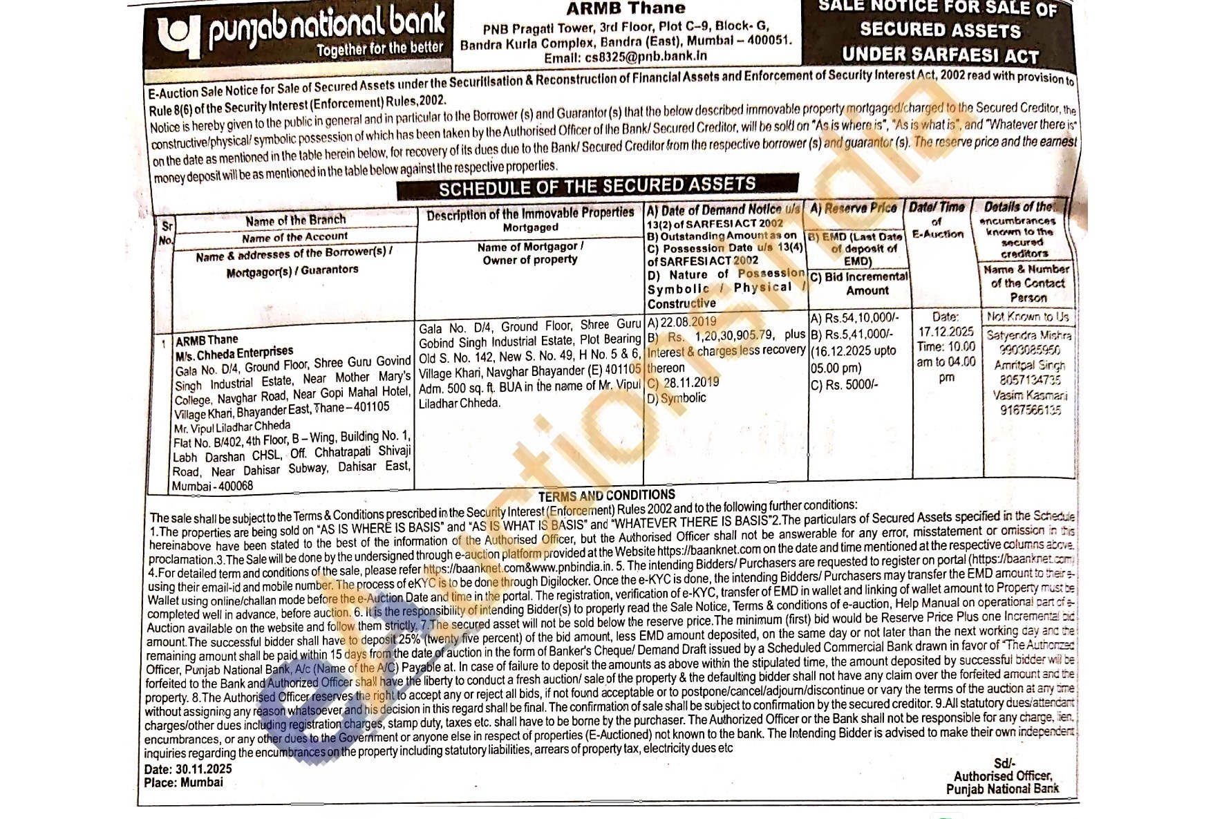 Gala No. D/4, Ground Floor, Shree Guru Gobind Singh Industrial Estate, Plot Bearing Old S. No. 142, New S. No. 49, H No. 5 & 6, Village Khari, Navghar Bhayander (E) 401105 Adm. 500 sq. ft. BUA in the name of Mr. Vipul Liladhar Chheda