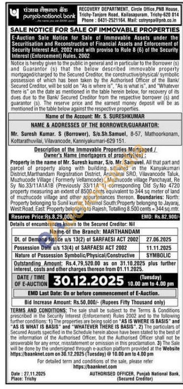 All that part and parcel of property along with building situated in the Kanyakumari District, Marthandam Registration District, Arumanai SRO, Vilavancode Taluk, Muzhucode Village (Formerly Vellamcode), Muzhucode village Panchayat, Re Sy No.33/11A1A1B (Previously 33/11A 1) corresponding Old Sy. No 4720 property measuring an extent of 8500 cents equivalent to 344 sq meter of land of muzhucode village and other appurtenances thereon. Boundaries: North: Property belonging to Sunil kumar, Minimal South: Property belonging to Jayaraj, West Road, East: Property belonging to Rajesh, Totalling 8.500 cents=344 sq.mtr.