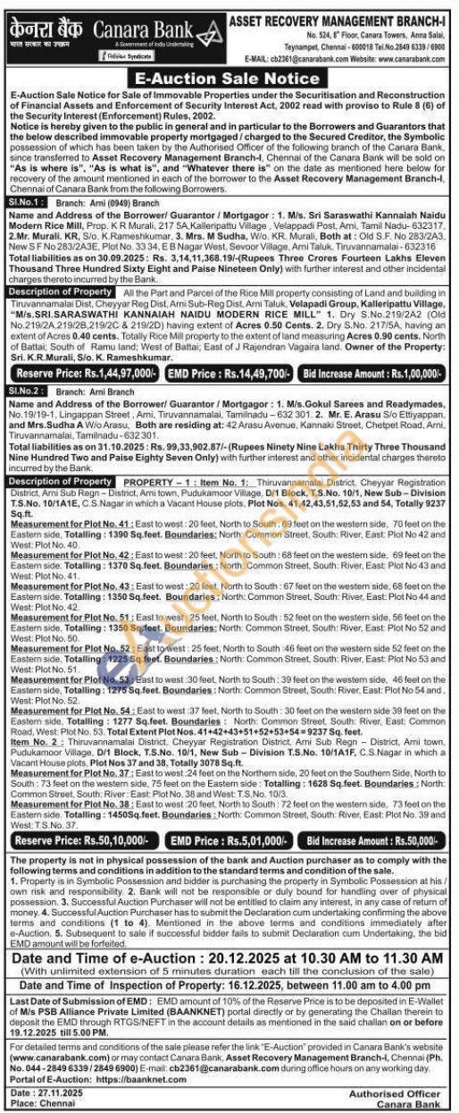 PROPERTY-1: Item No. 1: Thiruvannamalla District Cheyyar Registration District Ami Sub Regn-District. Ami town, Pudukamoor Village, Drt Block, T.S.No. 10/1, New Sub-Division T.S.No. 10/1A1E, C.S. Nagar in which a Vicant House plots. Plot Nos. 41.42.43,51,52,53 and 54, Totally 9237 Sq Measurement for Plot No. 41: East to west 20 feet, North to South: 69 feet on the western side, 70 feet on the Eastern side. Totalling: 1300 Sq.feet. Boundaries: North: Common Street. South: River, East: Plot No 42 and West: Plot No. 40 Measurement for Plot No. 42: Eant to west: 20 feet, North in South: 68 feet on the westem side, 5 feet on the Eastern side. Totalling: 1370 Sq.feet. Boundaries: North: Common Street South: Rover, East: Plot No 43 and West: Plot No. 41. Measurement for Plot No. 43: East to west: 20 feet North to South 67 feet on the western side. 68 fast on the Eastern side. Totalling: 1350 Sq.foet. Boundaries: North: Common Street, South: River East: Plot No 44 and West: Plot No. 42. Measurement for Plot No. 51: East to west 25 feet. North to South: 52 feet on the western side, 56 feet on the Eastern side, Totalling: 1350 Sq. feet Boundaries: North Common Street, South: River, East: Plot No 52 and West: Plot No. 50. Measurement for Plot No. 52: East to west 25 feet, North to South 46 feet on the westem side 52 feet on the Eastern side. Totalling: 1225 Sq feet. Boundaries: North Common Street, South: River East Plot No 53 and West: PlothNo. 51 Measurement for Plot No. 53: East to wast: 30 feet, North to South: 30 feet on the westem side, 46-feet on the Eastem side, Totalling: 1275 Sq feet. Boundaries: North Common Street, South River, East: Plot No 54 and Wast: Pict No. 52 Measurement for Plot No. 54: East to west 37 fost, North to South 30 feet on the western side 30 fest on the Eastern side, Totalling: 1277 Sq.feet. Boundaries North Common Street flouth: River East: Common Road, West: Plot No. 53. Total Extent Plot Nos. 41+42+43+51+52-53+54-9237 Sq. feet. Hom No. 2: Thiruvannamalai District, Cheyyar Registration District. Ami Sub Regn-District, Ami town, Pudukamoor Village, D/1 Block, T.S.No. 10/1, New Sub-Division T.S.No. 10/1A1F, CS. Nagar in which a Vacant House plots. Plot Nos 37 and 38. Totally 3078 Sq.ft. Measurement for Plot No. 37: East to west 24 feet on the Northem side, 20 feet on the Southem Side, North to South: 73 feet on the westem side, 75 feet on the Eastern side: Totalling: 1628 5q.feet. Boundaries: North: Corman Street South: River East: Plot No: 38 and West: TS No. 103 Measurement for Plot No. 38; East to west 20 feet, North to South: 72 feet on the western side, 73 feet on the Eastem side. Totalling: 14505q.feet. Boundaries: North Common Street, South River, East: Plot No. 39 and Wast. TS No. 37