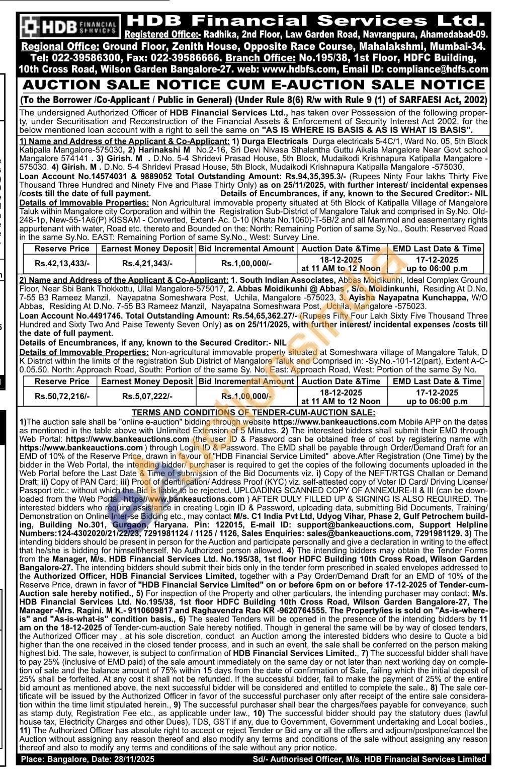 Details of Immovable Properties: Non-agricultural immovable property situated at Someshwara village of Mangalore Taluk, D K District within the limits of the registration Sub District of Mangalore Taluk and Comprised in: -Sy.No.-101-12(part), Extent A-C-0.05.50. North: Approach Road, South: Portion of the same Sy. No, East: Approach Road, West: Portion of the same Sy No