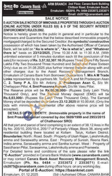 All that part and parcel of land comprising to an extent of 38.12 Ares in Re Sy No. 205/10, 205/10-4, 205/17 of Paripally Village, Block 38, along with residential building there located at Kollam Taluk, Kollam District. Boundaries: North Road. South: Property of Usah Rajan, Lakshmikutty amma and Saraswathy amma. East: Property of Suresh, Reena Rani, Indira amma, Saraswathy amma and Santha kumari. West: Property of Sasidharan Pillai, Sarasamma, Lakshmikutty amma and Prameela.