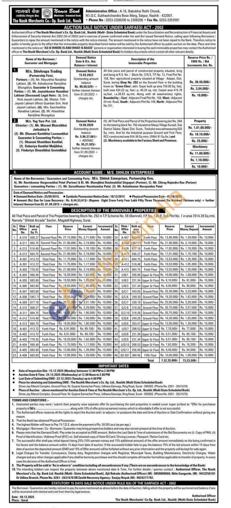 Contact (Authorised Officer) (M): 9850009666, Nitin Gangurde, (M): 9423256101 Or Udhna Branch, Phone No. 0261-2631670 OR Zenith Recovery Agency: Sanjay Nayak (M): 9824277792