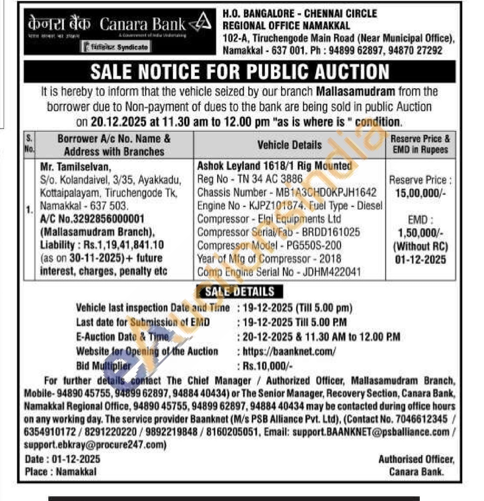 Ashok Leyland 1618/1 Rig Mounted Reg No-TN 34 AC 3886 Chassis Number - MB1A3CHD0KPJH1642 Engine No-KJPZ101874. Fuel Type - Diesel Compressor - Elgi Equipments Ltd Compressor Serial/Fab - BRDD161025 Compressor Model - PG550S-200 Year of Mfg of Compressor-2018 Comp Engine Serial No - JDHM422041