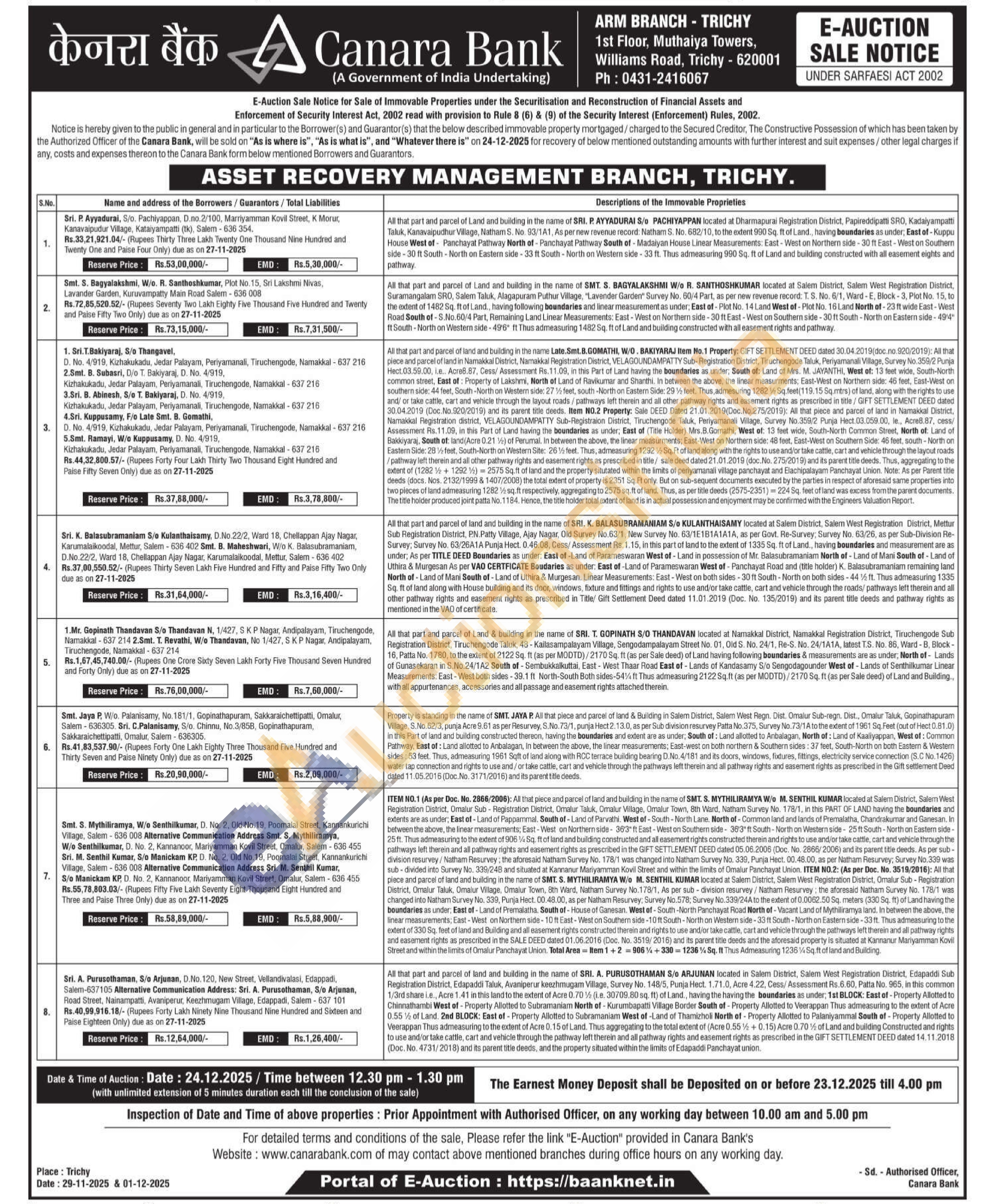 ITEM NO.1 (As per Doc. No. 2866/2006): All that piece and parcel of land and building in the name of SMT. S. MYTHILIRAMYA W/o M. SENTHIL KUMAR located at Salem District, Salem West Registration District, Omalur Sub-Registration District, Omalur Taluk, Omalur Village, Omalur Town, 8th Ward, Natham Survey No. 178/1, in this PART OF LAND having the boundaries and extents are as under, East of -Land of Pappammal. South of Land of Parvathi. West of South-North Lane. North of Common land and lands of Premalatha, Chandrakumar and Ganesan. In between the above, the linear measurements: East-West on Northern side-363 ft East-West on Southern side-363" ft South-North on Western side-25 ft South-North on Eastern side-25 ft. Thus admeasuring to the extent of 906 Sq. ft of land and building constructed and all easement rights constructed therein and rights to use and/or take cattle, cart and vehicle through the pathways left therein and all pathway rights and easement rights as prescribed in the GIFT SETTLEMENT DEED dated 05.06.2006 (Doc. No. 2866/2006) and its parent title deeds. As per sub-division resurvey/Natham Resurvey; the aforesaid Natham Survey No. 178/1 was changed into Natham Survey No. 339, Punja Hect. 00.48.00, as per Natham Resurvey: Survey No.339 was sub-divided into Survey No. 339/248 and situated at Kannanur Mariyamman Kovil Street and within the limits of Omalur Panchayat Union. ITEM NO.2: (As per Doc. No. 3519/2016): All that piece and parcel of land and building in the name of SMT. S. MYTHILIRAMYA W/o M. SENTHIL KUMAR located at Salem District, Salem West Registration District, Omalur Sub-Registration District, Omalur Taluk, Omalur Village, Omalur Town, 8th Ward, Natham Survey No.178/1, As per sub-division resurvey/Natham Resurvey; the aforesaid Natham Survey No. 178/1 was changed into Natham Survey No, 339, Punja Hect. 00.48.00, as per Natham Resurvey, Survey No.578; Survey No.339/24A to the extent of 0.0062.50 Sq. meters (330 Sq. ft) of Land having the boundaries as under: East of Land of Premalatha, South of House of Ganesan. West of South-North Panchayat Road North of Vacant Land of Mythiliramya land. In between the above, the linear measurements: East-West on Northern side-10 ft East-West on Southern side-10 ft South-North on Western side-33 ft South-North on Eastern side-33 ft. Thus admeasuring to the extent of 330 Sq. feet of land and Building and all easement rights constructed therein and rights to use and/or take cattle, cart and vehicle through the pathways left therein and all pathway rights and easement rights as prescribed in the SALE DEED dated 01.06.2016 (Doc. No. 3519/2016) and its parent title deeds and the aforesaid property is situated at Kannanur Mariyamman Kovil Street and within the limits of Omalur Panchayat Union. Total Area Item 1+29063301236% Sq. ft Thus Admeasuring 1236% Sq ft of land and Building.