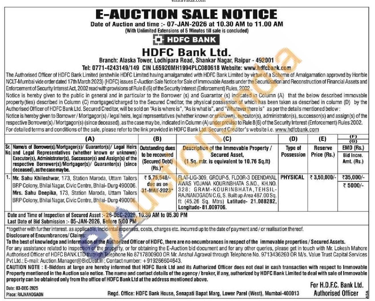 FLAT-LIG-309, GROUP-5, FLOOR-3 DEENDAYAL AWAS YOJANA KOURINBHATA S.NO., KH.NO. 328; GRAM-KOURINBHATA, TEHSIL-RAJNANDGAON C.G, S. Built up Area 487.00 Sq. ft (45.26 Sq. Mtrs) Latitude- 21.088282, Longitude-81.009706