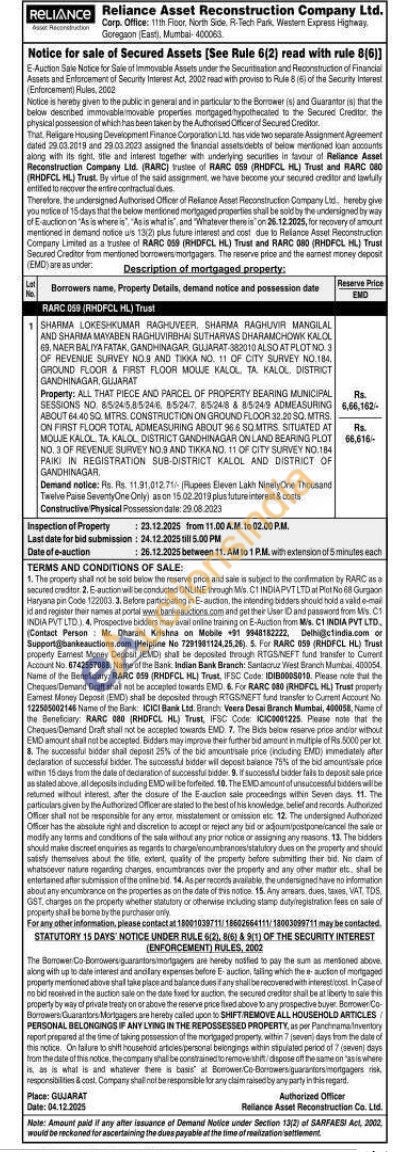 Property: ALL THAT PIECE AND PARCEL OF PROPERTY BEARING MUNICIPAL SESSIONS NO. 8/5/245.8/5/246, 85/247, 85248 & 8/5/24/9 ADMEASURING ABOUT 64.40 SQ. MTRS. CONSTRUCTION ON GROUND FLOOR 32.20 SQ. MTRS. ON FIRST FLOOR TOTAL ADMEASURING ABOUT 966 SQ MTRS SITUATED AT MOLJE KALOL TA KALOL DISTRICT GANDHINAGAR ON LAND BEARING PLOT NO. 3 OF REVENUE SURVEY NO.9 AND TIKKA NO. 11 OF CITY SURVEY NO.184 PAIKI IN REGISTRATION SUB-DISTRICT KALOL AND DISTRICT OF GANDHINAGAR,