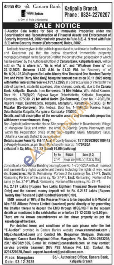 Details and full description of the movable assets and immovable properties with known encumbrances, if any.: Non-Agricultural immovable House Site property situated in Delanthabettu Village of Mangalore Taluk and within the limits of Soorinje Grama Panchayath and within the Registration office of the Sub-Registrar Mulki, Mangalore Taluk, Dakshina Kannada District & comprised in: