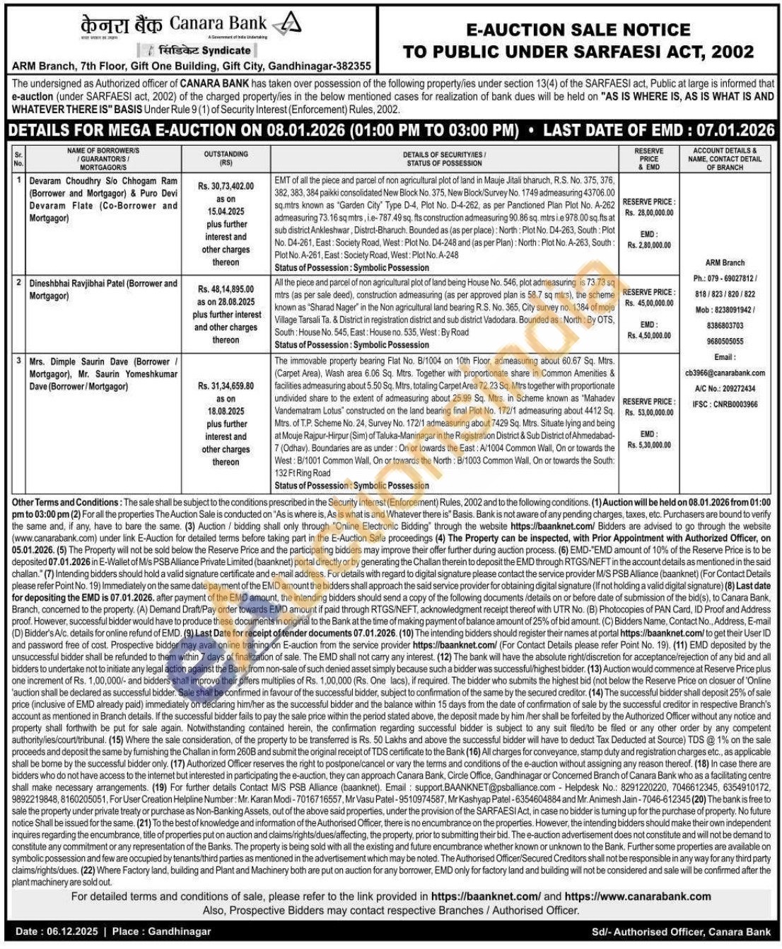 The immovable property bearing Flat No. B/1004 on 10th Floor, admeasuring about 60.67 Sq. Mtrs. (Carpet Area), Wash area 6.06 Sq. Mtrs. Together with proportionate share in Common Amenities & facilities admeasuring about 5.50 Sq. Mtrs, totaling Carpet Area 72.23 Sq. Mtrs together with proportionate undivided share to the extent of admeasuring about 25.99 Sq. Mtrs. in Scheme known as "Mahadev Vandematram Lotus" constructed on the land bearing final Plot No. 172/1 admeasuring about 4412 Sq. Mtrs. of T.P. Scheme No. 24, Survey No. 172/1 admeasuring about 7429 Sq. Mtrs. Situate lying and being at Mouje Rajpur-Hirpur (Sim) of Taluka-Maninagar in the Registration District & Sub District of Ahmedabad-7 (Odhav). Boundaries are as under: On or towards the East: A/1004 Common Wall, On or towards the West: B/1001 Common Wall, On or towards the North: B/1003 Common Wall, On or towards the South 132 Ft Ring Road