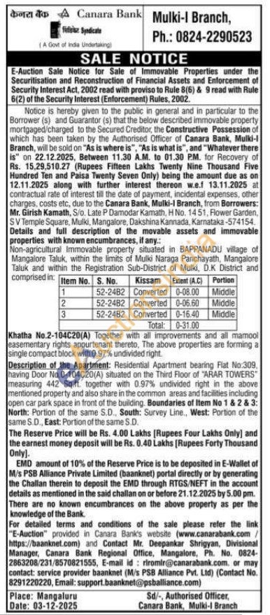 Details and full description of the movable assets and immovable properties with known encumbrances, if any : Non-agricultural Immovable property situated in BAPPANADU village of Mangalore Taluk, within the limits of Mulki Naraga Panchayath, Mangalore Taluk and within the Registration Sub-District of Mulki, D.K District and