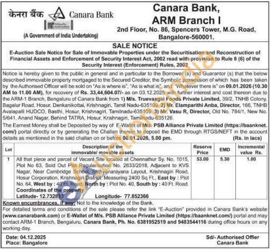All that piece and parcel of Vacant Site located at Chennathur Sy. No. 1015, Plot No 63, Sold Out Plot Regularisation No. 2633/2018, Adjacent to KVS Nagar, Near Cambridge School, Sathyanarayana Layout, Krishnagiri Road, Hosur Corporation, Krishnagiri District. Measuring 2400 Sq Ft., East by: Plot No. 64, West by: 40 Ft. Road, North by: Plot No. 40, South by: 40 Ft. Road