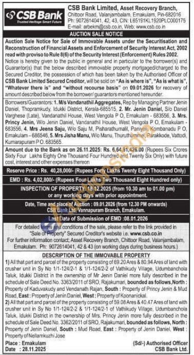 1) All that part and parcel of the property consisting of 69.20 Ares & 80.94 Ares of land with crusher unit in Sy No 1/1-124/2-1 & 1/1-124/2-2 of Vathikudy Village, Udumbanchola Taluk, Idukki District in the ownership of Mr Jenin Daniel more fully described in the schedule of Sale Deed No. 3363/2011 of SRO, Rajakumari, bounded as follows, North: Property of Kaduvakudy and Vendanath Rajan, South: Property of Princy Jenin & Mud Road, East: Property of Jenin Daniel, West: Property of Koonanickal.
