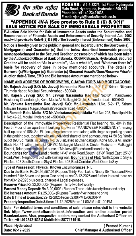 Description of the Immovable Property/s: Residential Flat bearing No. 404 in the Fourth Floor of an apartment building known as "MANIDWEEP RESIDENCY", having built-up area of 1064 Sq. Ft. (including common area) along with single car parking space in the parking slot, together with an undivided share of land admeasuring 44.50 Sq. Yards out of 890 Sq. Yards, in Survey No. 378, situated at Chandabagh, Kohe Moula Ali, under Block No. 41 within limits of GHMC Malkajgiri Mandal & Circle, Medchal - Malkajgiri District, Telangana state in the name of Mr. Javvaji Rajesh and bounded by: Boundaries for Entire Land: North: 14'-0" wide Road, South: 33'-0" Road, East: 25'-0" Road, West: Neighbor's plot with existing wall. Boundaries of Flat: North: Open to Sky & Flat No. 403, South: Open to Sky & Flat No. 403, East: Corridor, West: Open to Sky