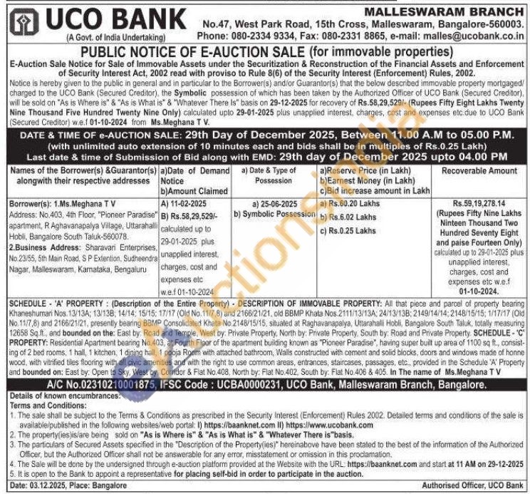 SCHEDULE 'A' PROPERTY: (Description of the Entire Property) DESCRIPTION OF IMMOVABLE PROPERTY: All that piece and parcel of property bearing Khaneshuman Nos. 13/13A; 13/138, 14/14: 15/15; 17/17 (Old No. 11/7,8) and 2166/21/21. old BBMP Khata Nos 2111/13/13A: 24/13/138: 2149/14/14: 2148/15/15; 1/17/17 (Old No. 11/7,8) and 2166/21/21, presently bearing BBMP Consolidated Khata No 2148/15/15, situated at Raghavanapalya, Uttarahalli Hobli, Bangalore South Taluk, totally measuring 12658 Sq.ft., and bounded on the: East by Road and Temple, West by: Private Property, North by: Private Property, South by: Road and Private Property: SCHEDULE-'C' PROPERTY: Residential Apartment bearing No.403, at Fourth Floor of the apartment building known as "Pioneer Paradise", having super built up area of 1100 sq ft., consist-ing of 2 bed rooms, 1 hall, 1 kitchen, 1 dining hall, 1 pooja Room with attached bathroom, Walls constructed with cement and solid blocks, doors and windows made of honne wood, with vitrified tiles flooring with all civic amenities and with the right to use common areas, entrances, staircases, passages, etc., provided in the Schedule 'A' Property and bounded on: East by: Open to Sky, West by: Corridor & Flat No.408, North by: Flat No.402, South by: Flat No.406 & 405. In The name of Ms. Meghana TV