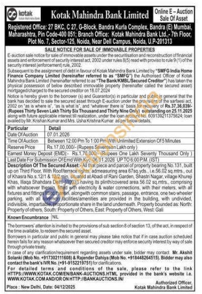 Description Of The Secured Asset:-All that piece and parcel of property bearing No. 131, built up on Third Floor, With Roof/terrace rights, admeasuring area 67sq yds, ie.56.02 sq.mirs, out of Khasra Nos. 12/1 & 12/2 min, situated at Abadi of Rani Garden, Shastri Nagar, village Khureji Khas, Illaqa Shahdara Delhi-110031 having its plinth/covered area 56.02 sq.mtrs., comprising with whatsoever therein, fitted with electricity & water connections, with their meters, with all fixtures and fittings fitted therein, alongwith common stairs, passage, entrance, one two wheeler parking with all common facilities/amenities are provided in the building, with undivided, Indivisible, impartiable, proportionate share in the land underneath. Property bounded as: North: Property of others, South: Property of Others. East Property of Others. West: Gali