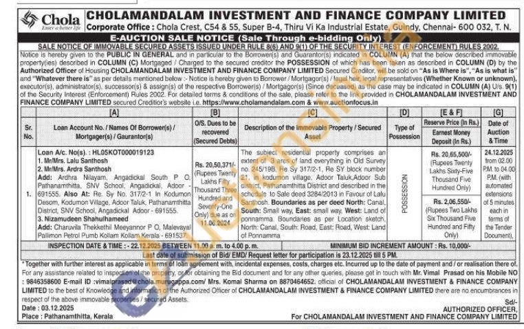 The subject residential property comprises an extent of 3 ares of land everything in Old Survey no. 245/198. Re Sy 317/2-1, Re SY błock number 21, in kodumon village. Adoor Taluk, Adoor Sub district, Pathanamthitta District and described in the schedule to Sale deed 3284/2013 in Favour of Lalu Santhosh Boundaries as per deed North: Canal, South: Small way, East: small way, West: Land of ponnamma. Boundaries as per Location sketch, North: Canal, South: Road, East: Road, West Land of Ponnamma