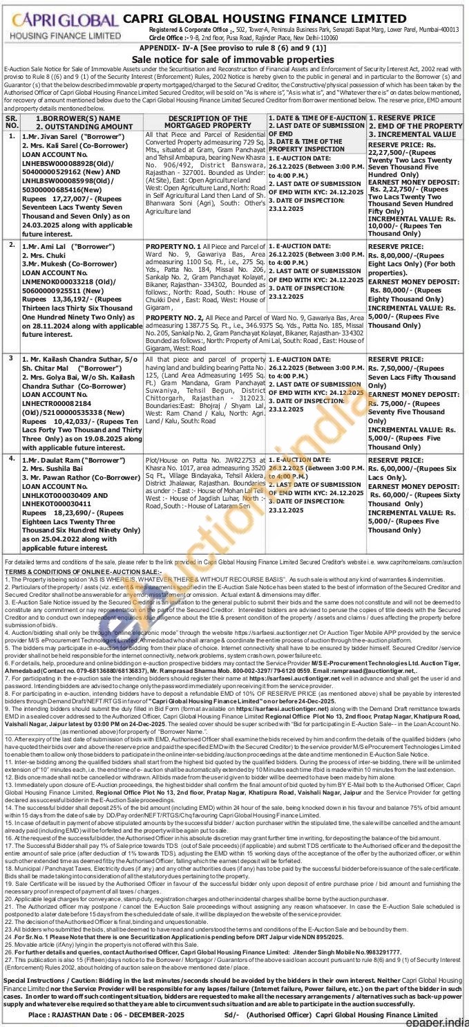 PROPERTY NO. 1 All Piece and Parcel of Ward No. 9, Gawariya Bas, Area admeasuring 1100 Sq. Ft., l.e., 275 Sq. Yds., Patta No. 184, Missal No. 206, Sankalp No. 2, Gram Panchayat Kolayat, Bikaner, Rajasthan-334302, Bounded as follows:, North: Road, South: House of Chukki Devi, East: Road, West: House of Gigaram,PROPERTY NO. 2, All Piece and Parcel of Ward No. 9, Gawariya Bas, Area admeasuring 1387.75 Sq. Ft., i.e., 346.9375 Sq. Yds., Patta No. 185, Missal No. 205, Sankalp No. 2, Gram Panchayat Kolayat, Bikaner, Rajasthan-334302 Bounded as follows:, North: Property of Ami Lal, South: Road, East: House of Gigaram, West: Road
