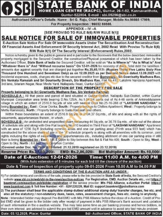 DESCRIPTION OF THE PROPERTY FOR SALE : Property belonging to Sri Gowrisetty Madhava Rao, Sio Venkata Ramajah : SCHEDULE-A: All that piece and parcel of land situated in Guntur District, Nallapdu Sub-District, within Guntur Municipal Corporation area limits bearing D.No.125/A, Ac. 1.04 3/4 cents out of Ac.4-46 cents of Ankireddypalem village in which an extent of 2516.8 Sq yds of site with nearest Door No 25-16-268 of "LAKSHMI NANDANA" is being Bounded by: East: Circar Donka, South: Property belongs to Chillies Apartment, West: Property belongs to Mettu Ramireddy, North: Property belongs to Suda Ramaiah and others.