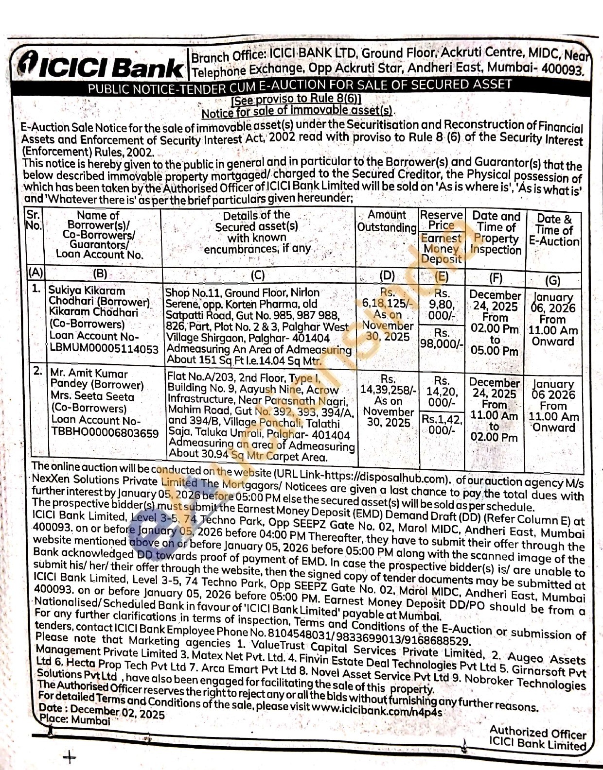 Flat No.A/203, 2nd Floor, Type I, Building No. 9. Aayush Nine, Acrow Infrastructure, Near Parasnath Nagri, Mahim Road, Gut No. 392, 393, 394/A, and 394/B, Village Panchali, Talathi Saja, Taluka Umroli, Palghar- 401404 Admeasuring an area of Admeasuring About 30.94 Sq Mtr Carpet Area.